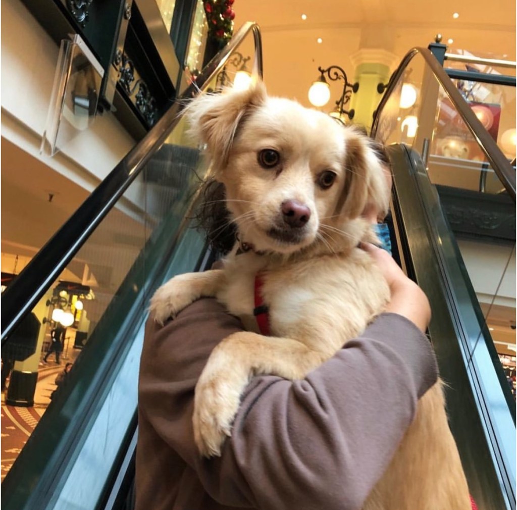 Fand sie ein bisschen seltsam, aber sie war wirklich mutig und ist mutig nebenher gelaufen. Nur auf der Rolltreppe wird sie getragen, das ist einfach zu gefährlich für kleine Pfoten:
