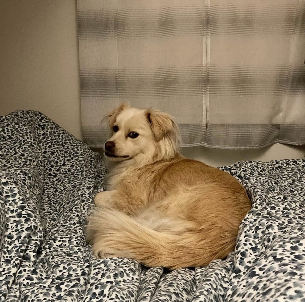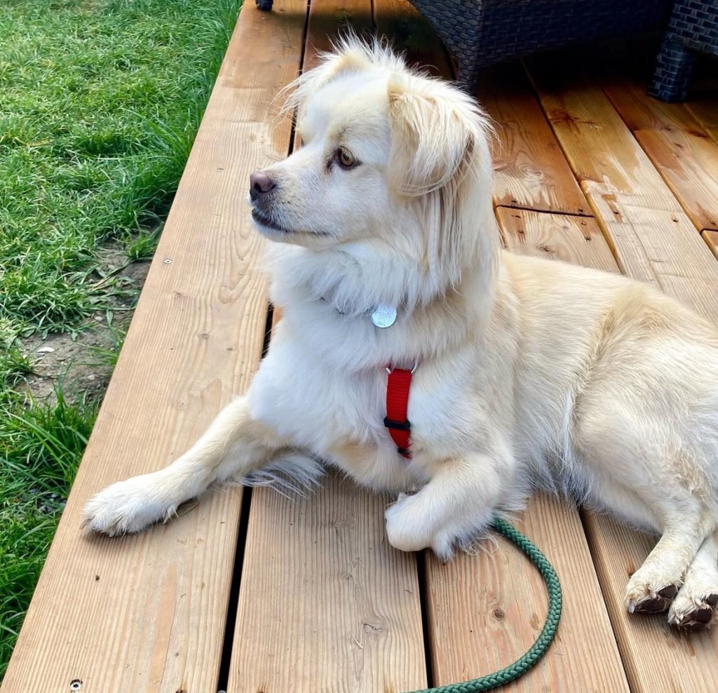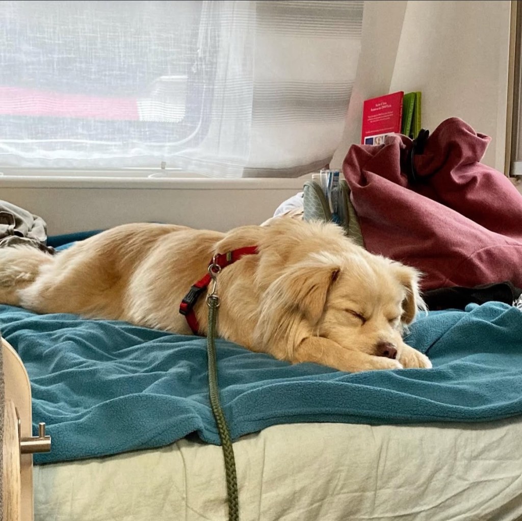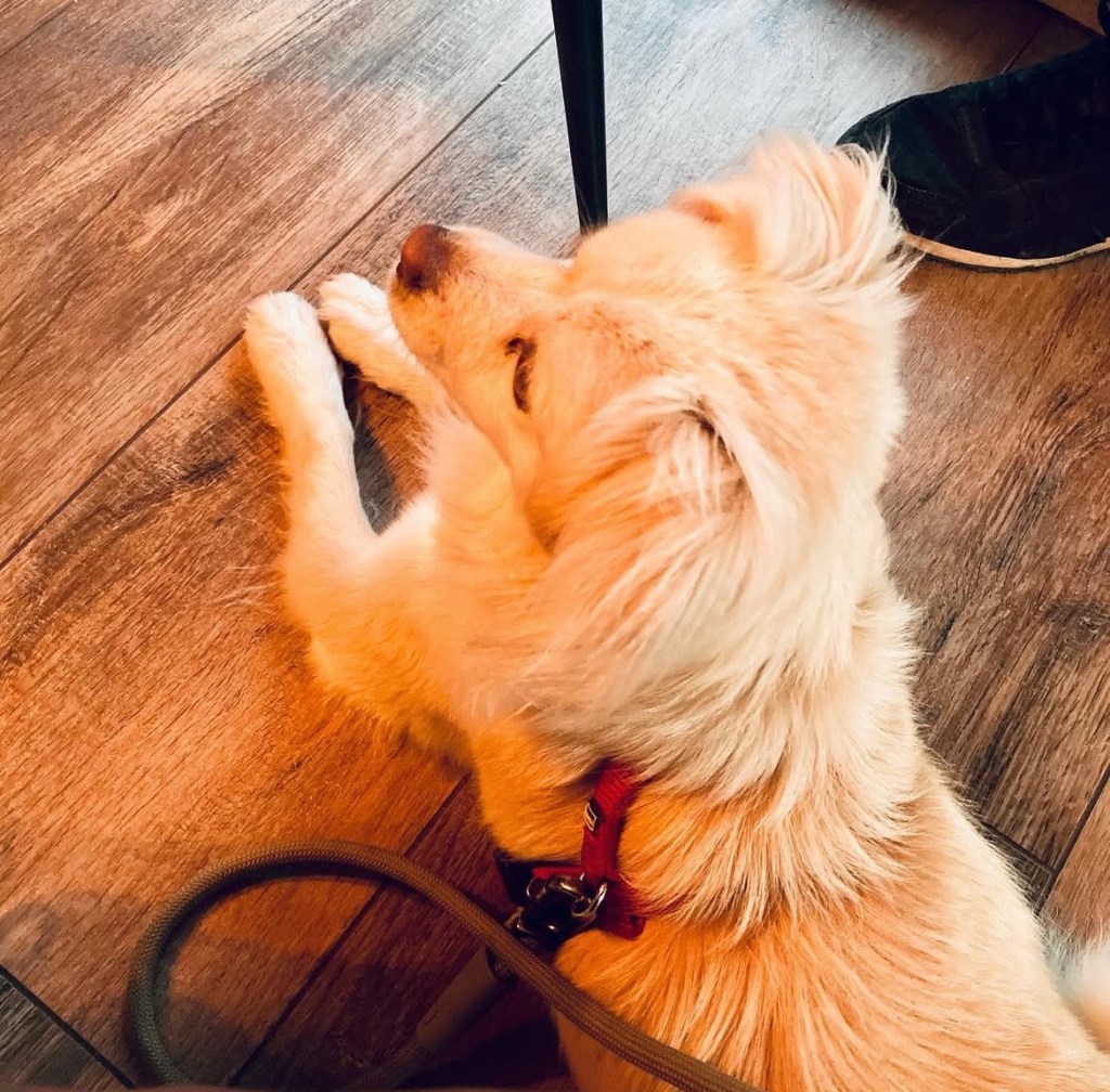 Fenja ist hier gern gesehener Gast und darf überall mit hin und im Lokal sogar auf der Bank schlafen.