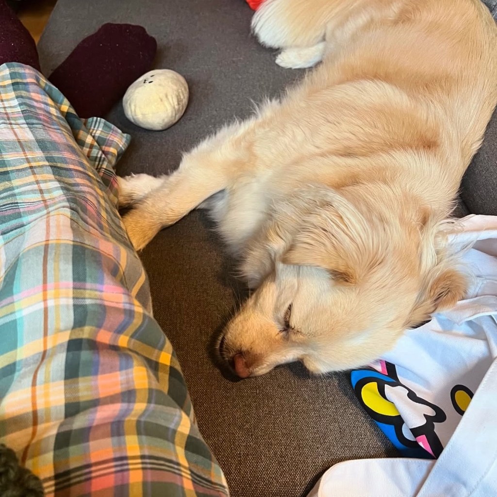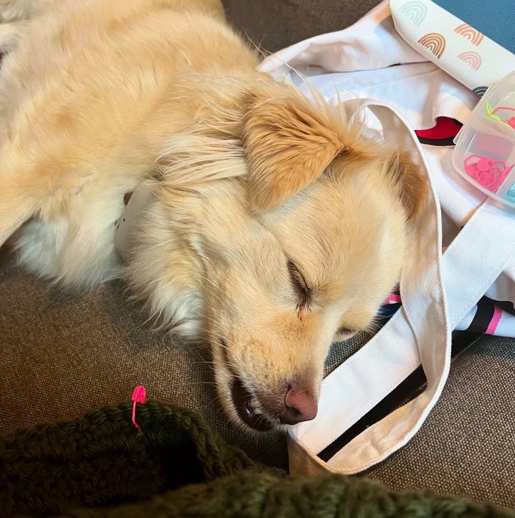 Liegt Fenja mitten zwischen dem Häkelkram und pennt gemütlich auf dem Wollsackerl, mit der Nase direkt am Werkstück – vollkommen unbeeindruckt.