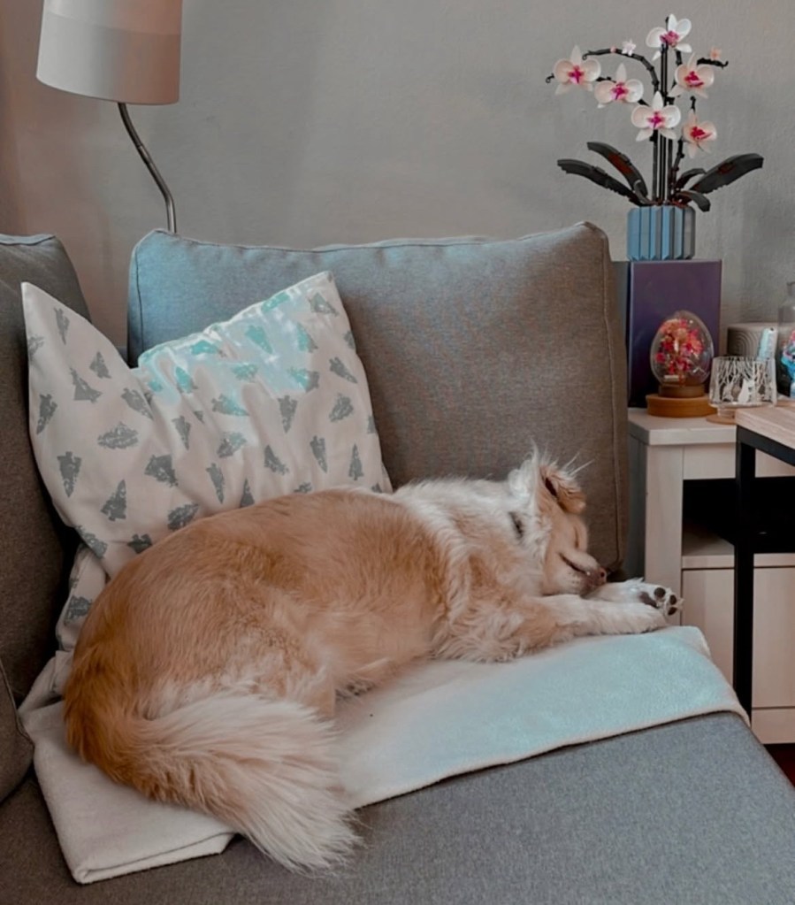 Fenja liebt Sofaknotzen und schläft besonders gut, wenn der Fernseher leise läuft und alle entspannt daheim im Warmen sind.