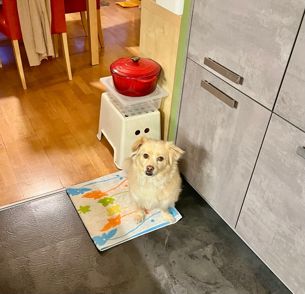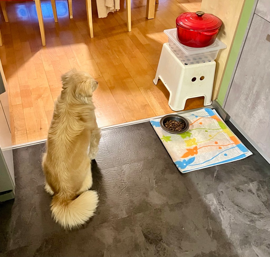 Nach etwa zehn Minuten hab ich den Napf weggestellt – zum Entsetzen von Fenja: Sie hat sich SOFORT auf ihre Napfunterlage gesetzt, ihr übliches Zeichen von „Ich hab Hunger!“.