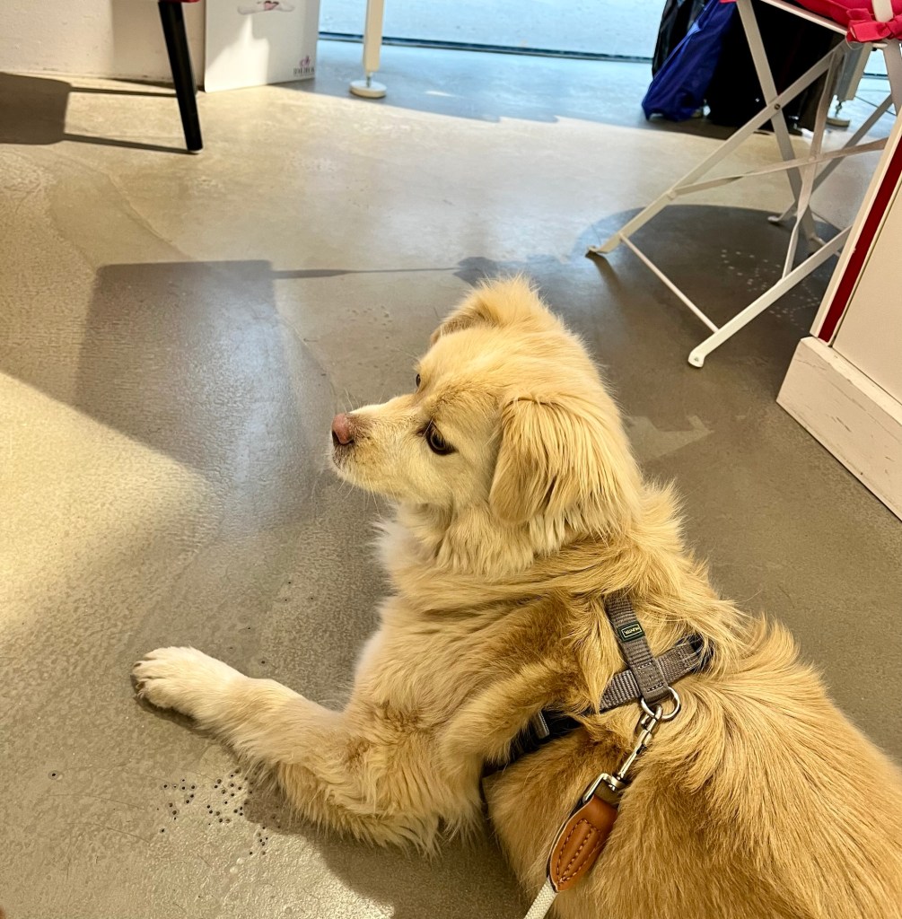 Sie war echt brav – v.a. in Anbetracht der Tatsache, dass es dort im Laden einen Hund gibt. Nach kurzem Beschnuppern hat Fenja ohne Probleme in einer netten Ecke gewartet:
