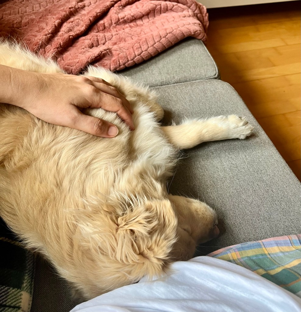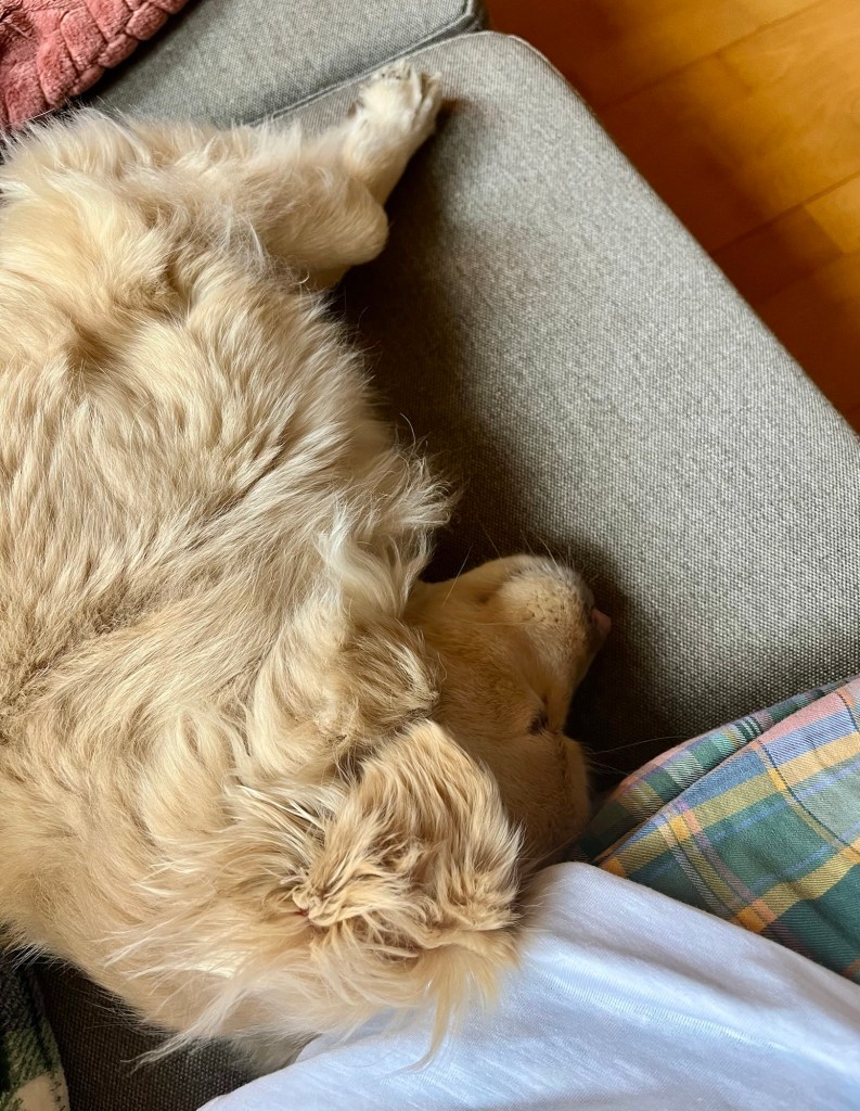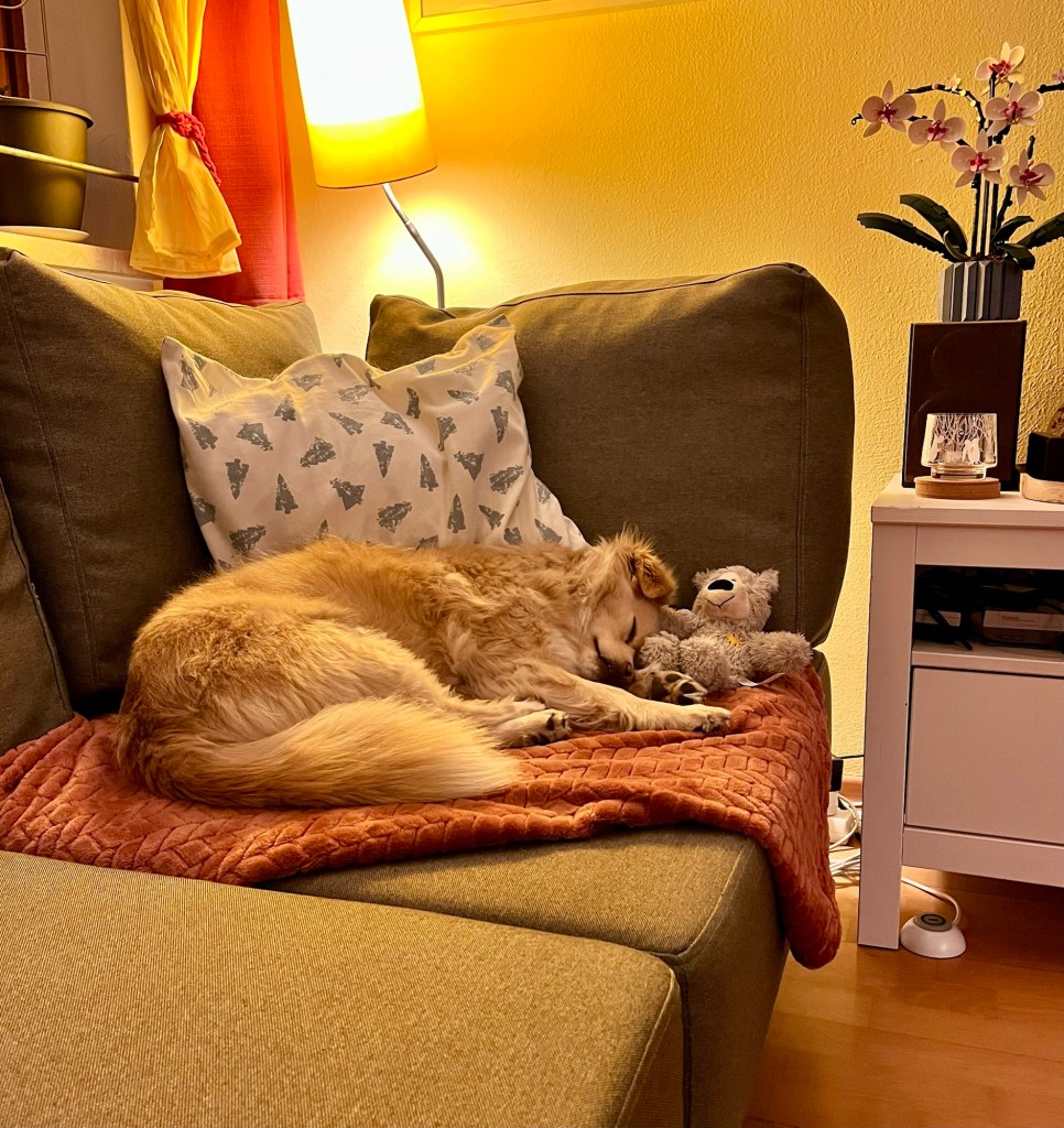 An Tagen, an denen wir viel trainiert haben, ist Fenja immer müde – besonders nach Trainings, die ihren Kopf beanspruchen. Da ist es wichtig, Ruhe zu üben und den Hund schlafen zu lassen.