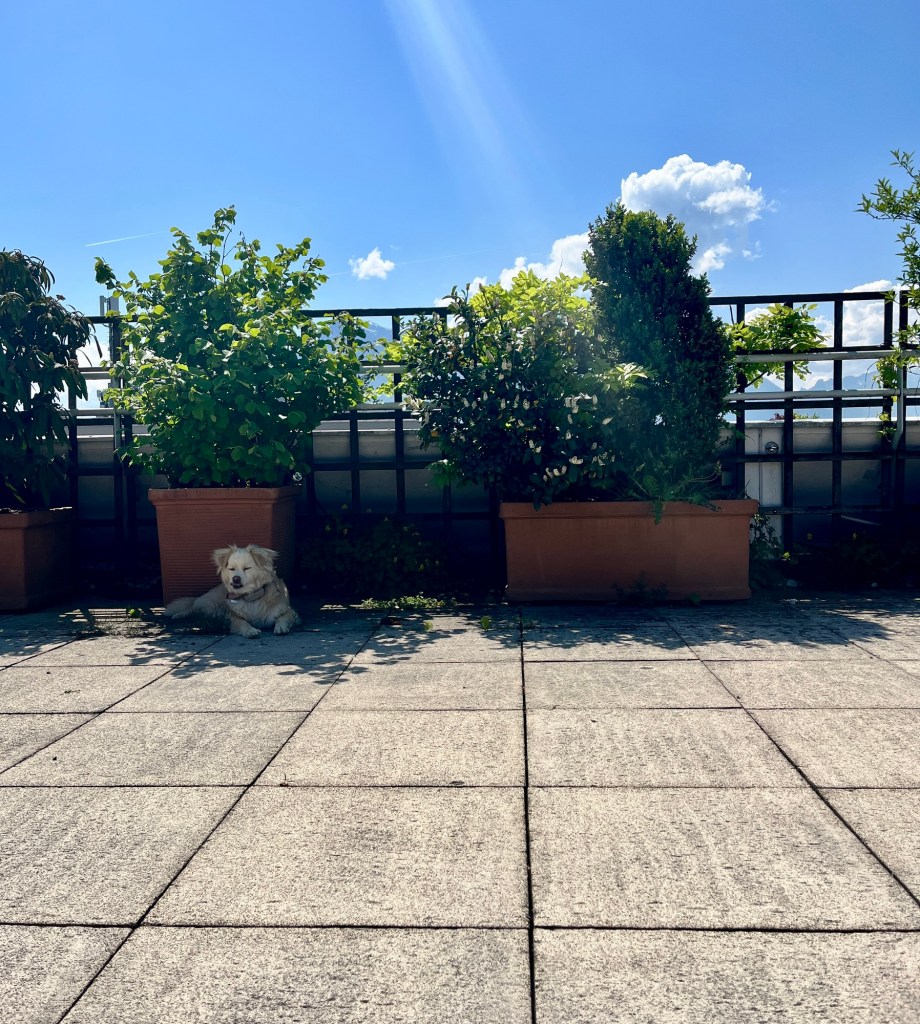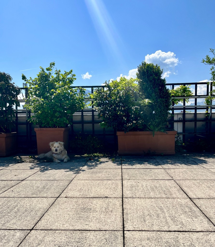 Fenja und ich haben unsere Mittagspause heute zuerst mit Gassigehen und dann auf der Dachterrasse unseres Büros verbracht: