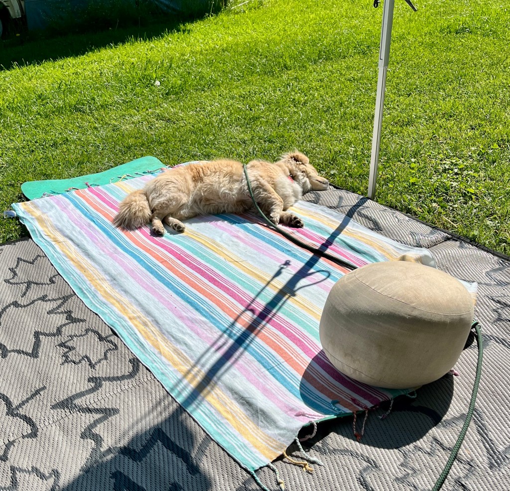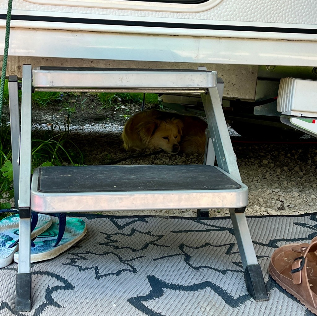 Den gestrigen Zwickeltag haben wir am Mattsee verbracht – Fenja war‘s anfangs viel zu heiß, sie lag deswegen unterm Wohnwagen: