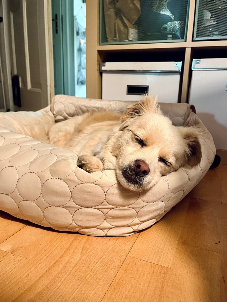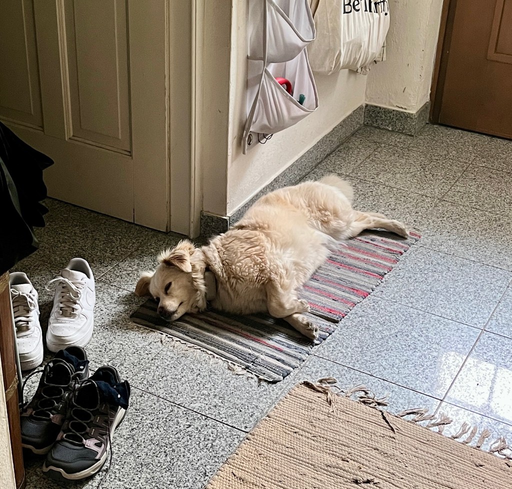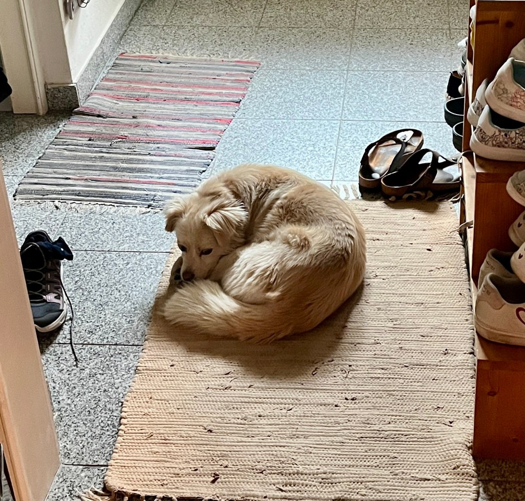 Am Wochenende geht‘s für uns in den Urlaub – wir freuen uns schon sehr auf Korsika. Fenja merkt das natürlich wie immer und bewacht die Tür – nicht dass wir ohne sie losfahren: