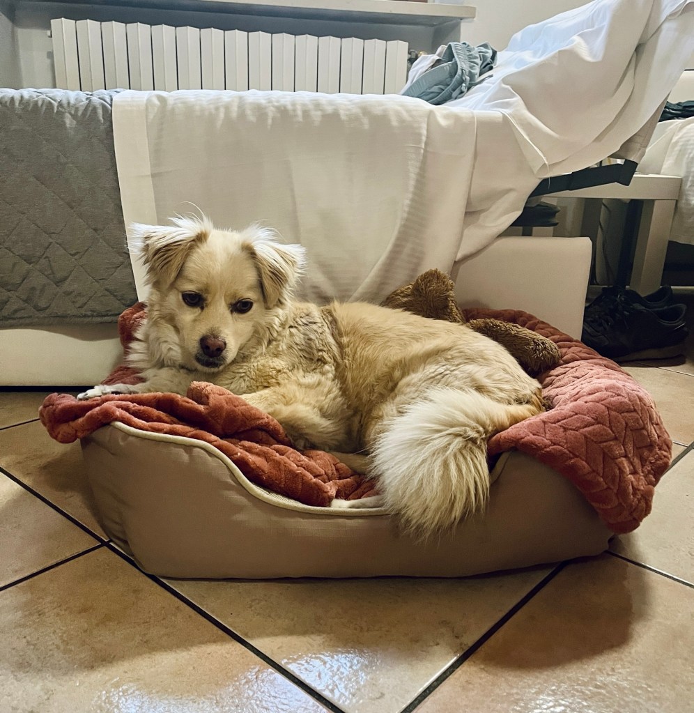 Erster Stopp: Verona. Wir schlafen hier nur eine Nacht, Fenja hat ihr eigenes Bett dabei: