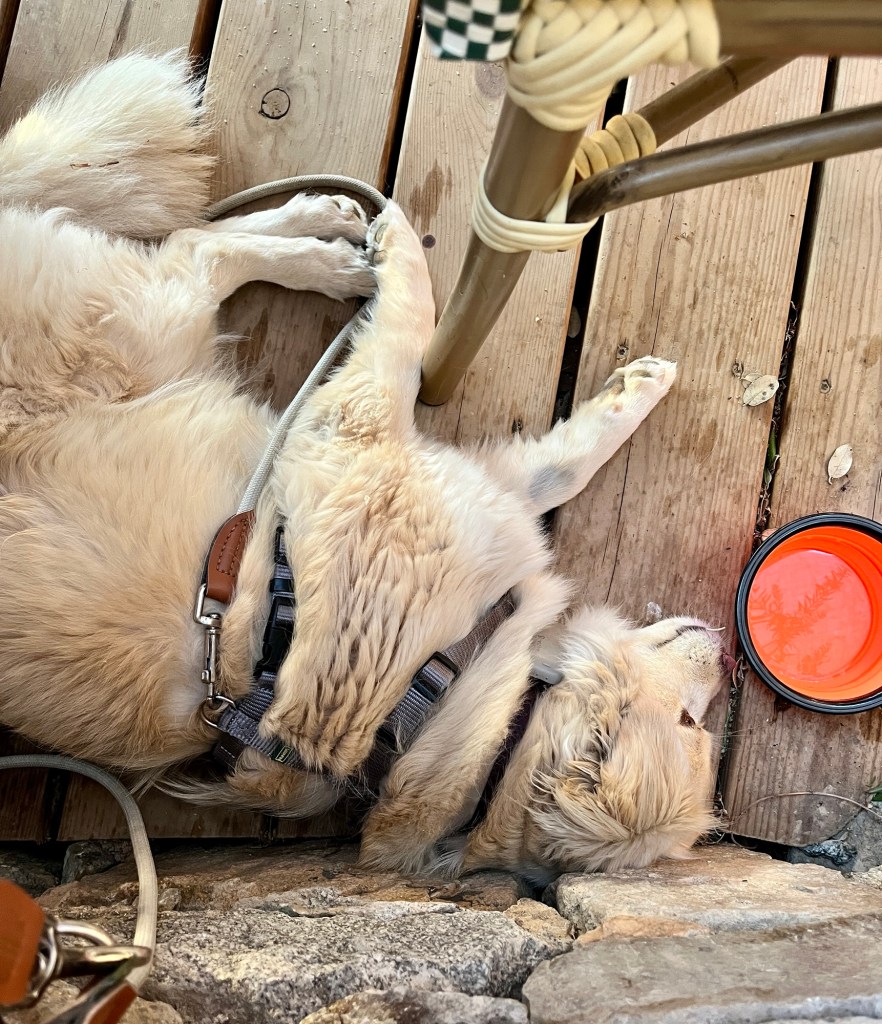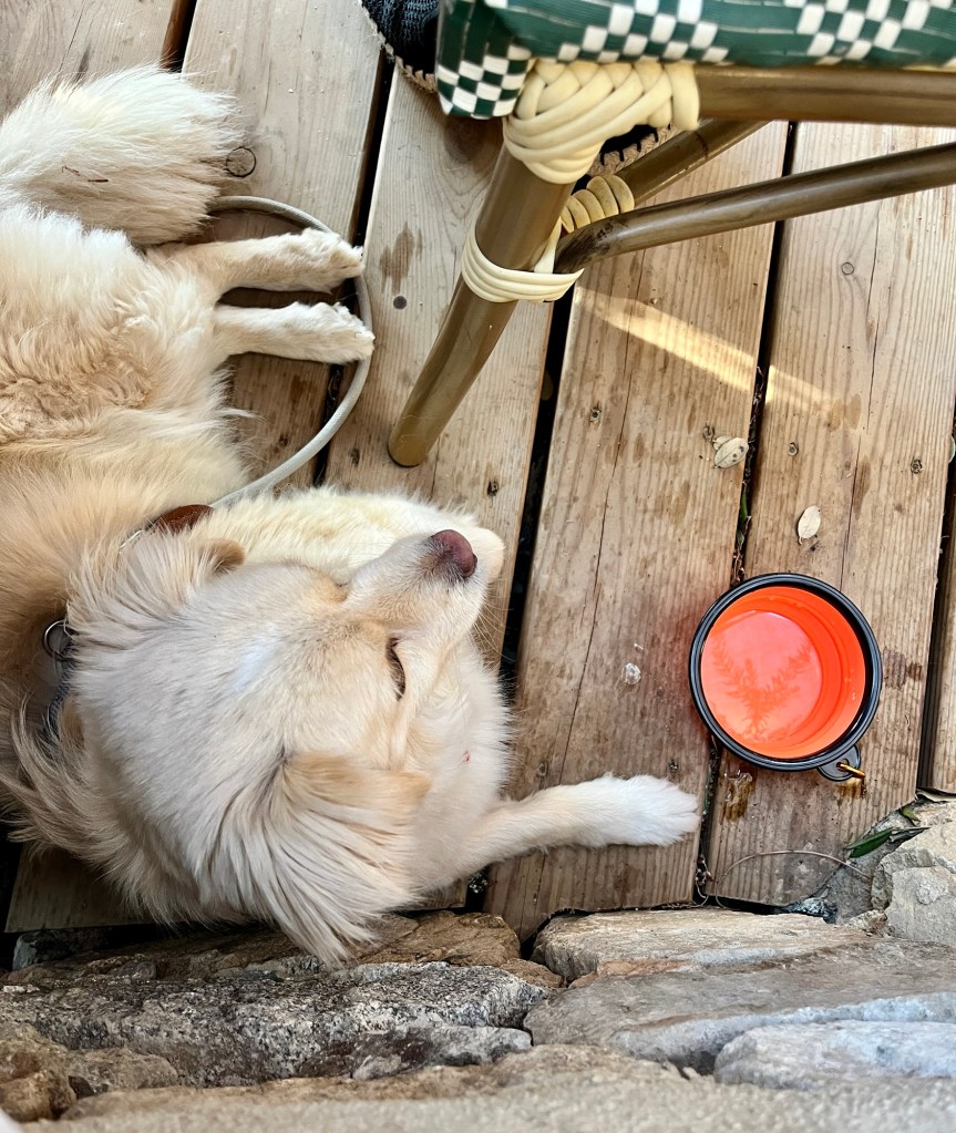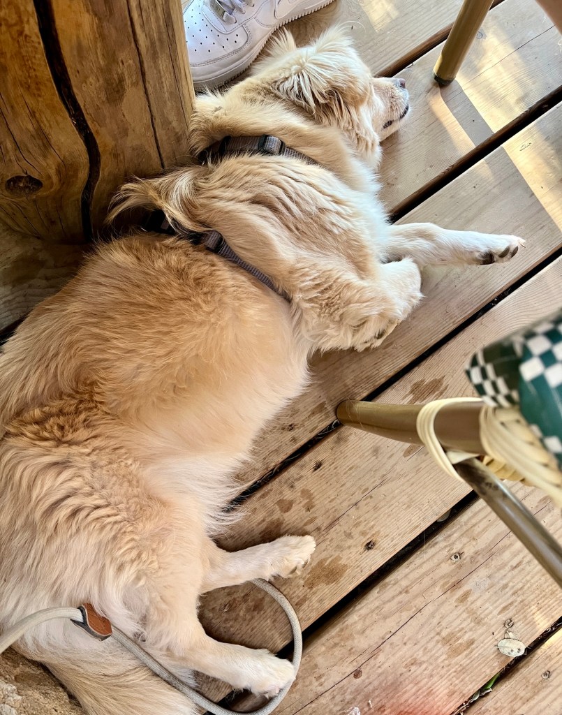 Hier gibt’s ein entzückendes Lokal, in dem man lokale Tapas bekommt – sehr lecker! Fenja hat sich wie immer in Lokalen vorbildlich verhalten und unterm Tisch gechillt – und manchmal ein Stückchen Käse bekommen.