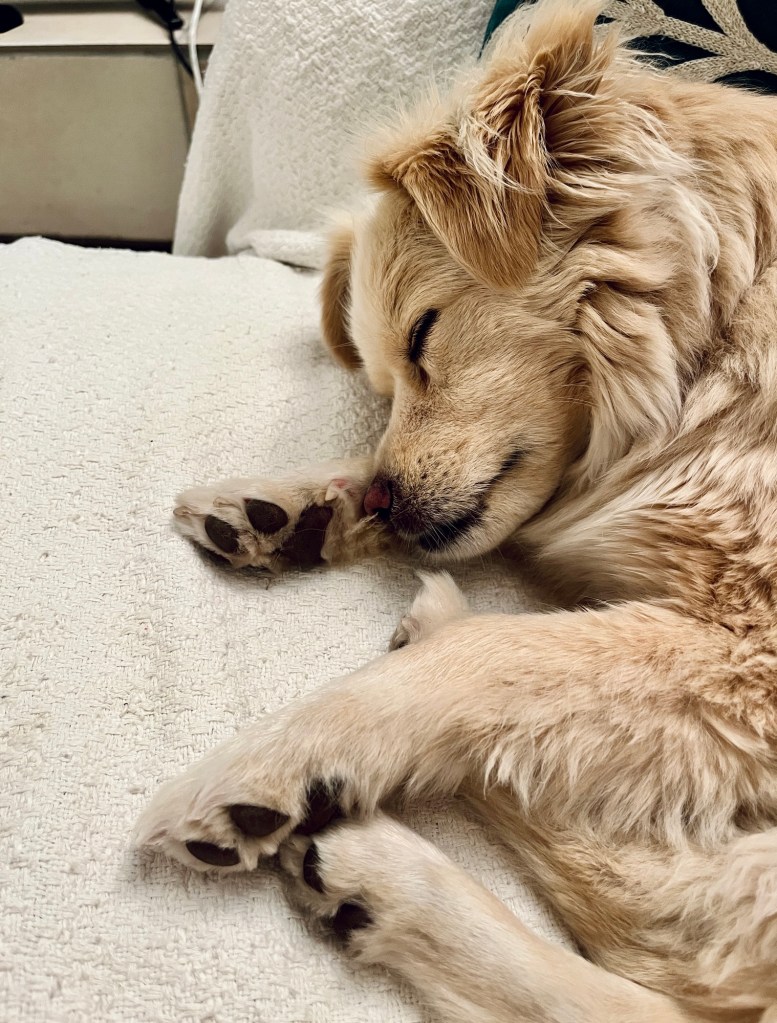 Wieder daheim haben wir dann gepackt – da musste Fenja natürlich sicherstellen, dass wir sie nicht vergessen. Am besten geht das, wenn sie sich mitten ins Zimmer legt, oder direkt neben den Koffer: