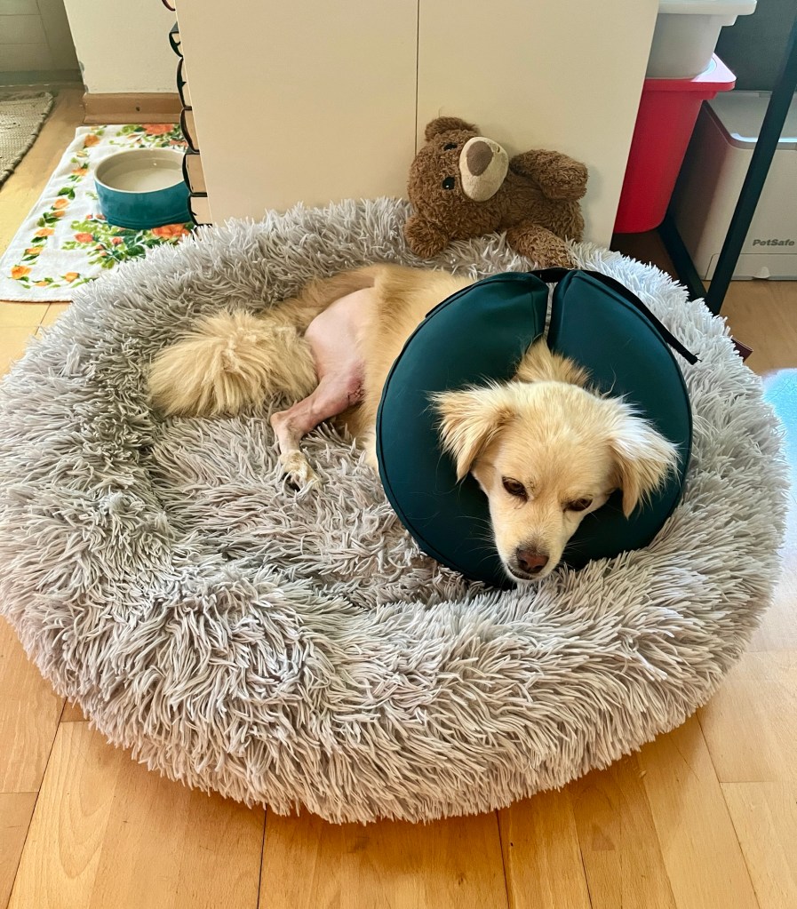 Heute Mittag durfte ich Fenja aus der Tierklinik abholen. Sie hat sich in Zeitlupe gefreut, weil sie so viele Schmerzmittel bekommen hat und etwas bedüselt war (ist!), und den Lampenschirm aka Halskrause fand sie auch doof, aber: