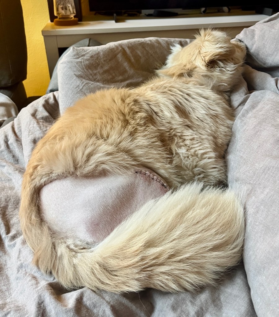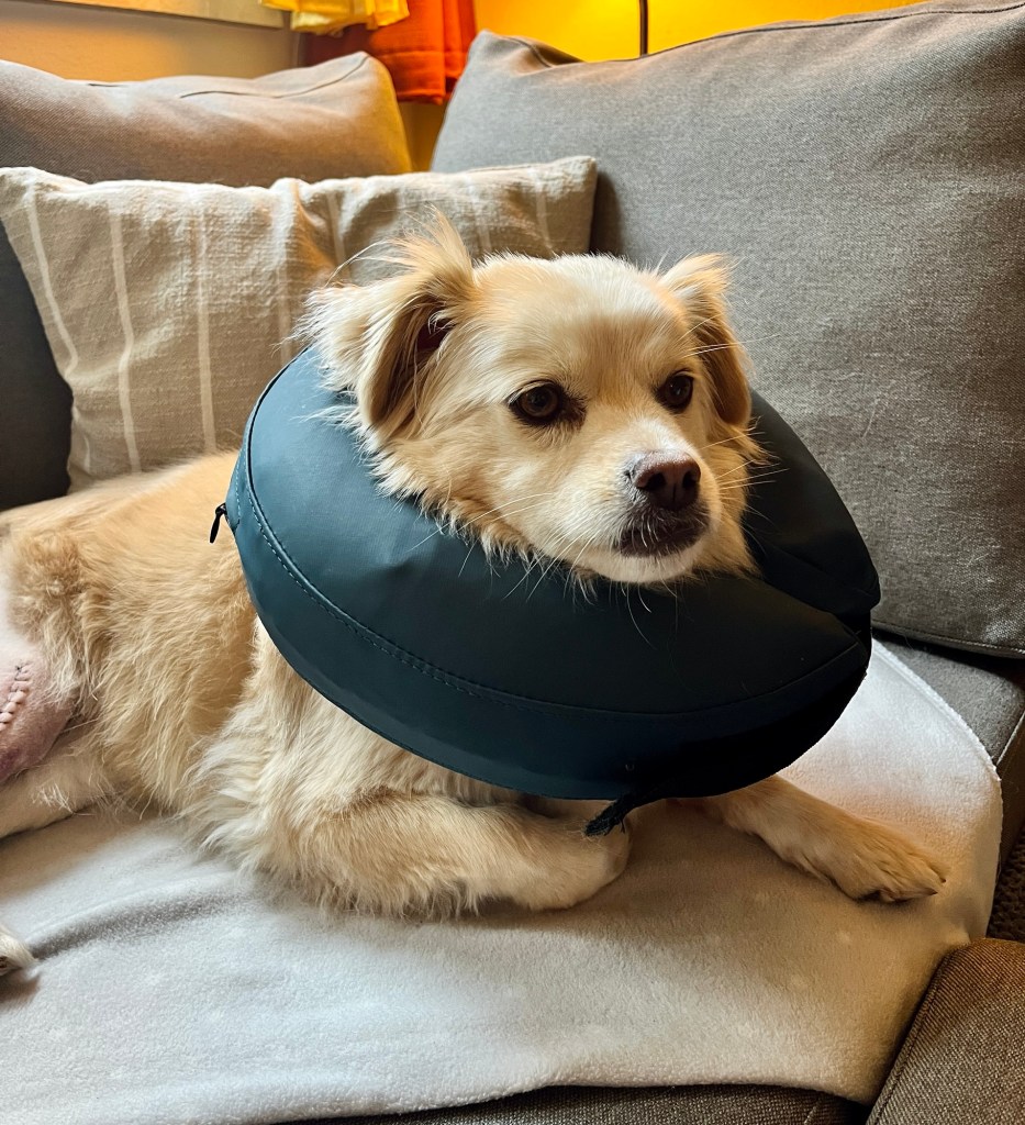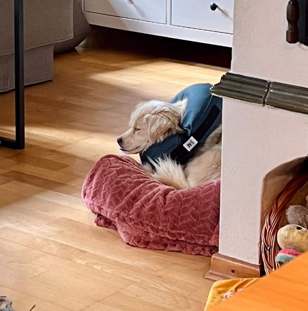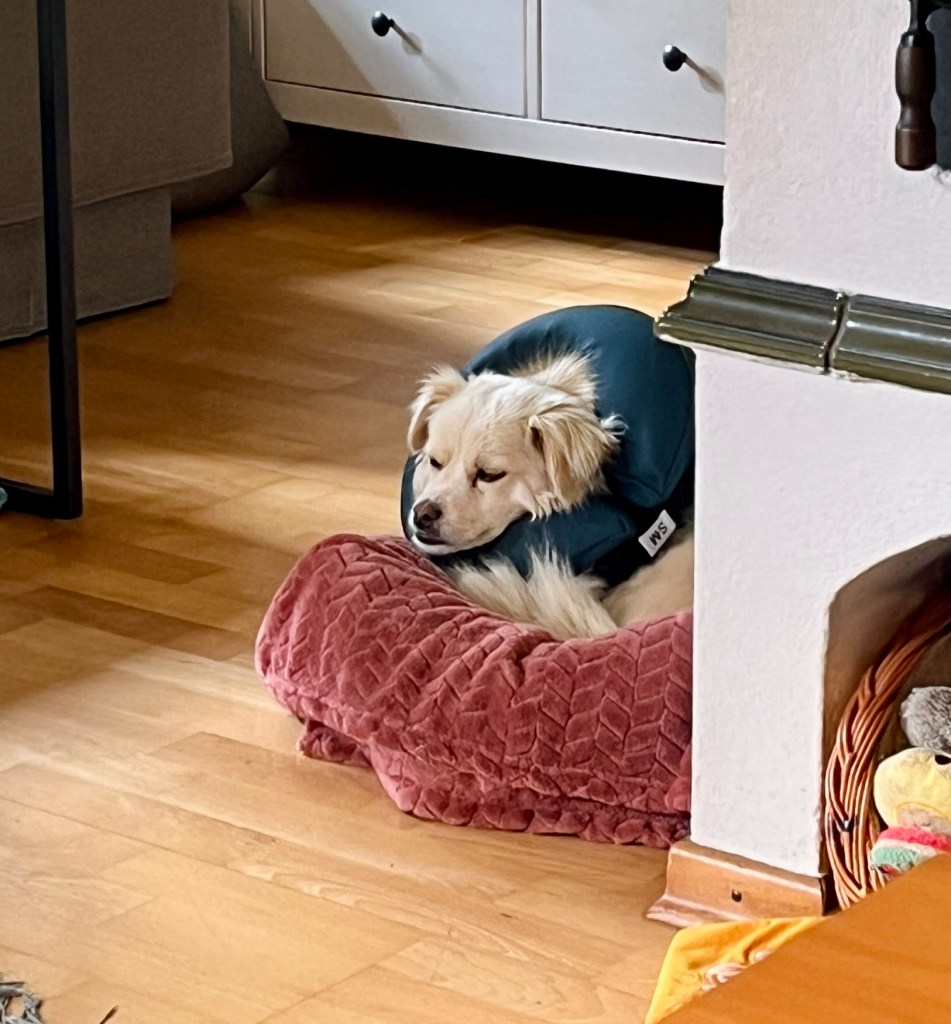 Sie wechselt zwischen ihren Bettchen hin und her und wirkt ganz ok. Wenn wir direkt bei ihr sind, darf sie ohne Halskrause liegen – sie versucht aber sowieso nicht ständig, am Bein zu lecken.