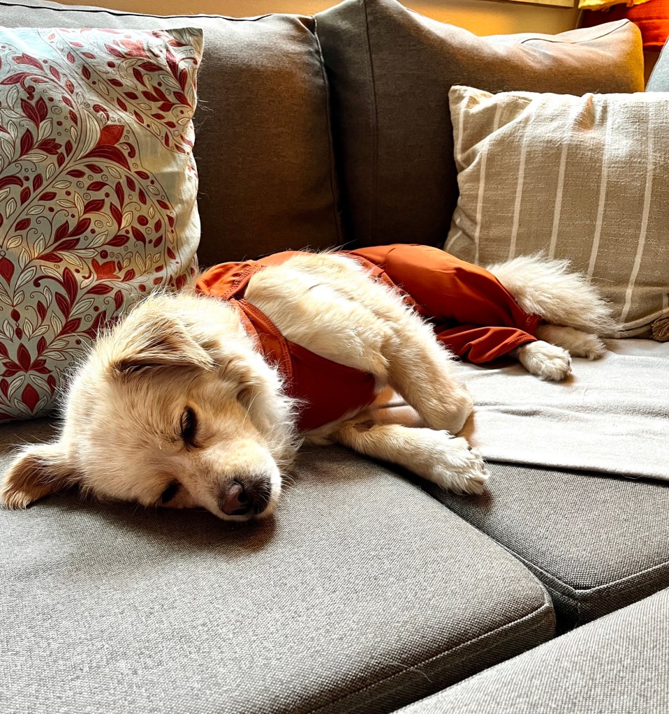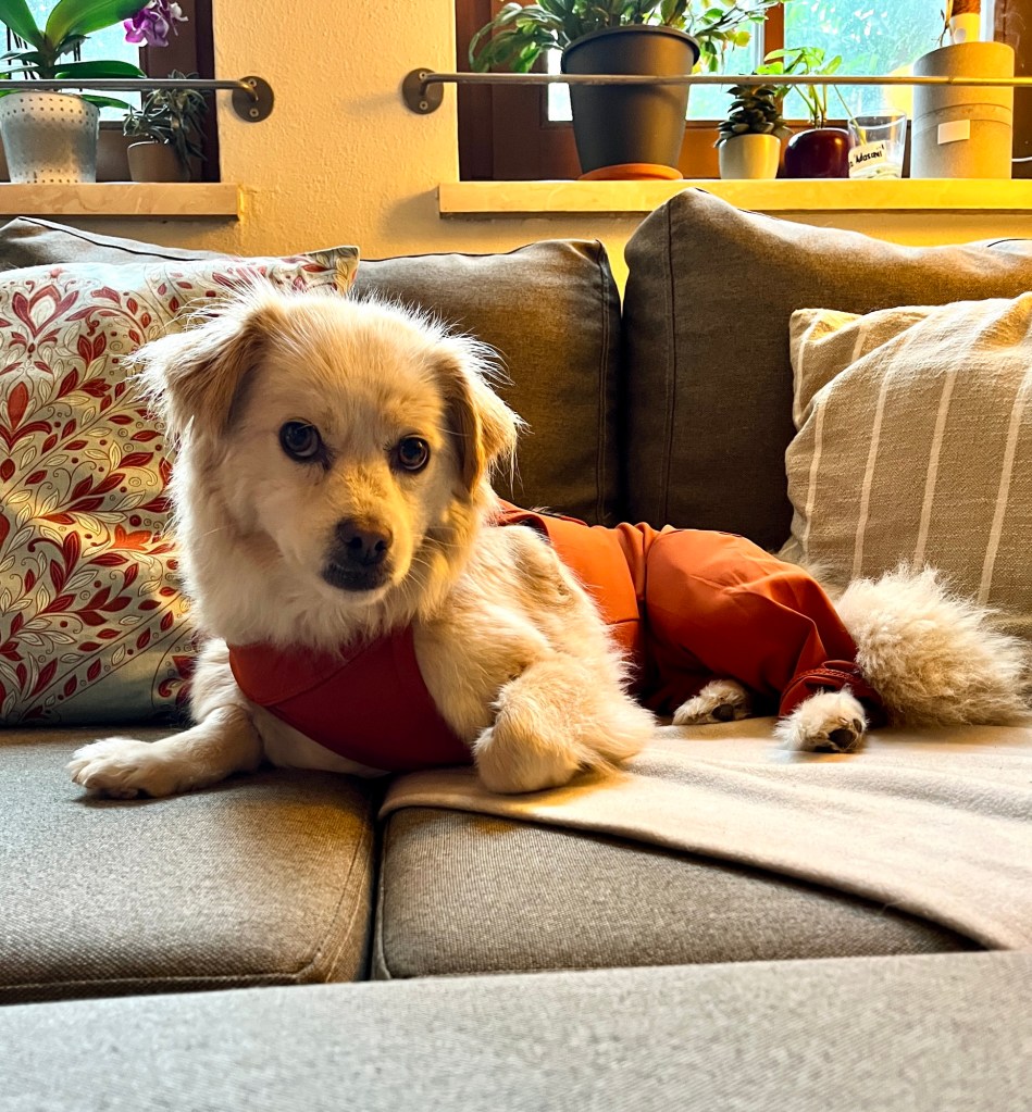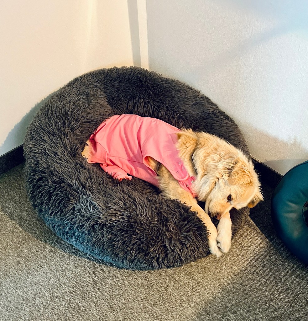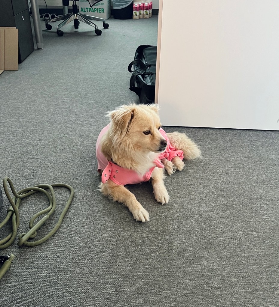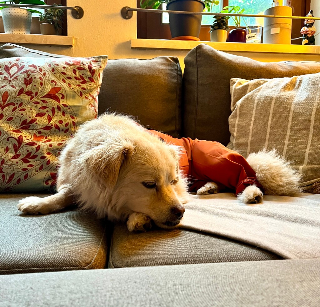 Fenja trägt ja eigentlich keine Klamotten außer Halstücher und je nach Wetter einen Regen- oder Wintermantel. Jetzt nach der Operation haben wir aber zwei Anzüge besorgt, die verhindern sollen, dass sie an der Wundnaht herumschleckt.