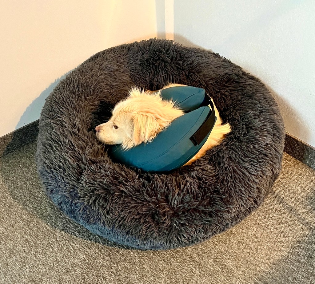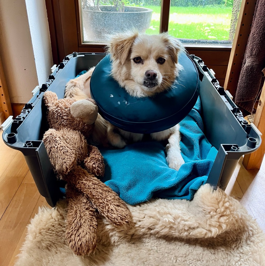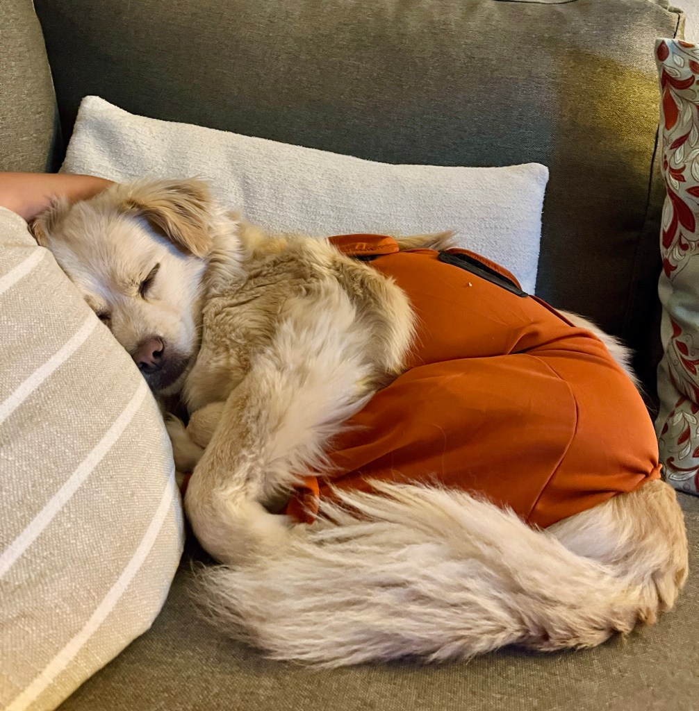 Am Montag war sie außerdem wieder mit im Büro. Dort hat sie ihren Post-OP-Anzug ausprobiert, der verhindern soll, dass sie an der Wundnaht schleckt, und ist viel rumgelegen.