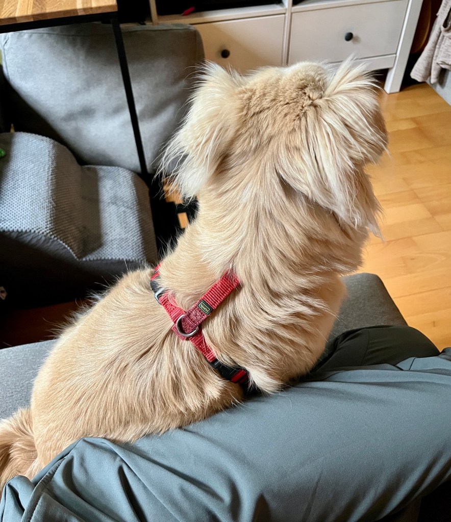 Fenja hat sich schon unglaublich gefreut, als ich die Sporthose angezogen hatte und sie ihr Agility-Geschirr, und ist mir nicht mehr von der Seite gewichen: