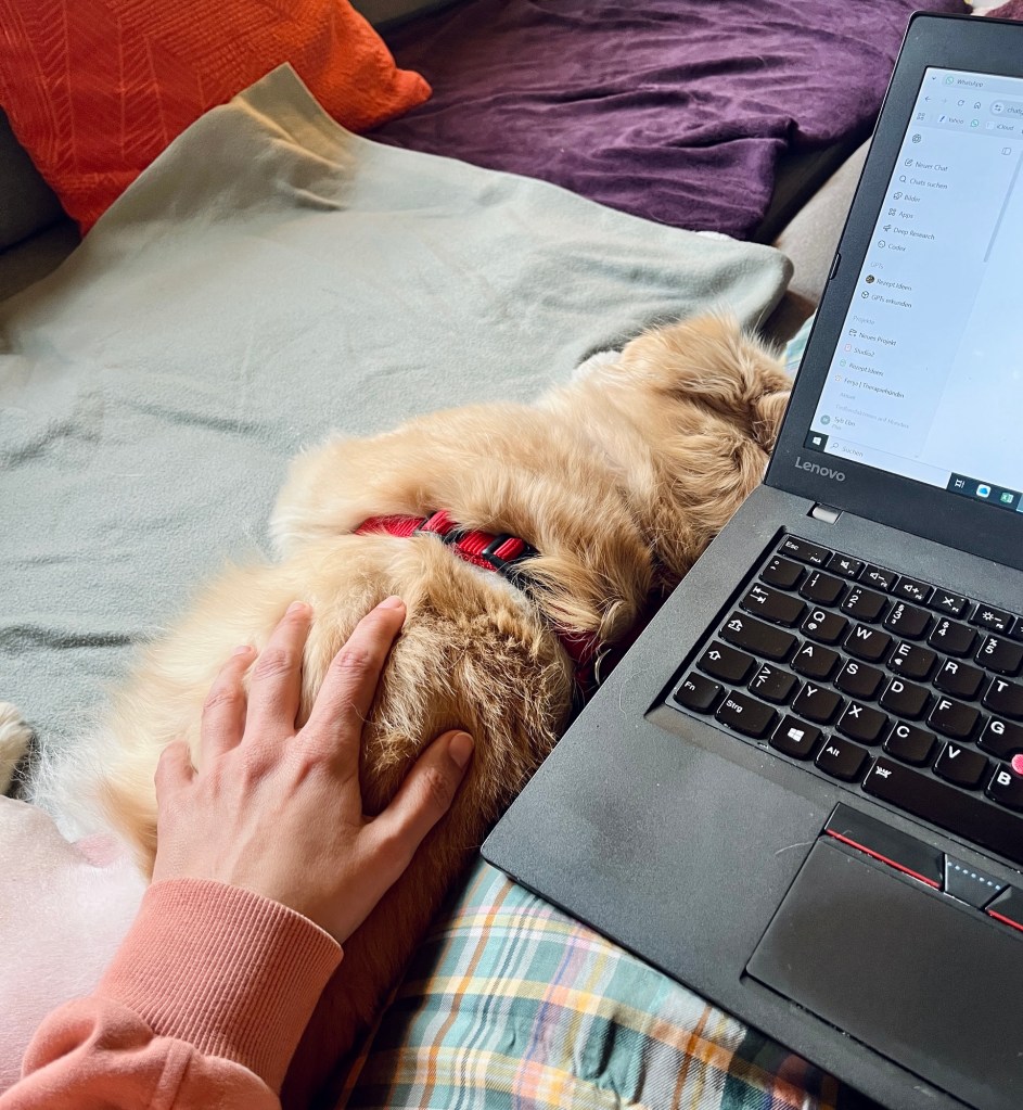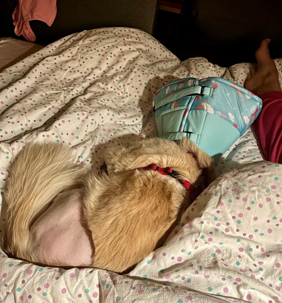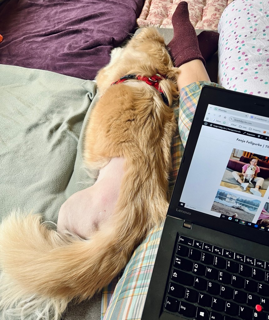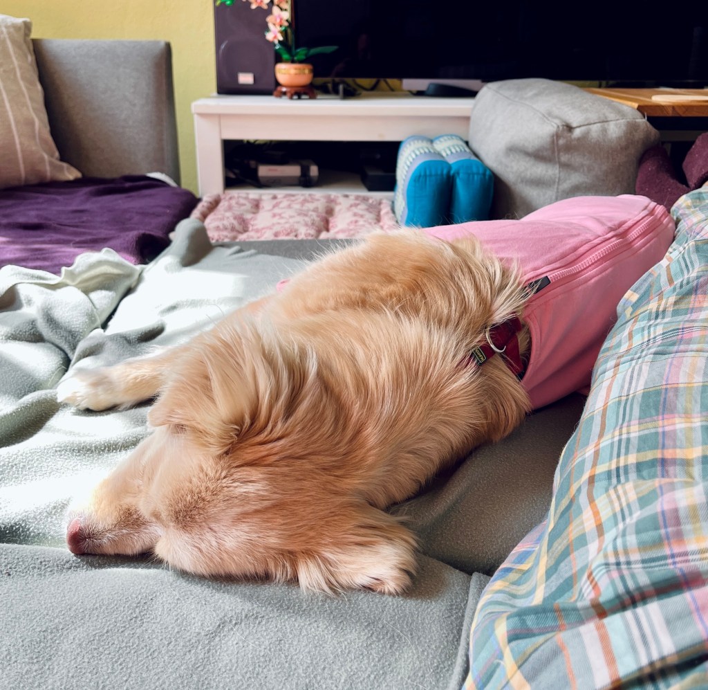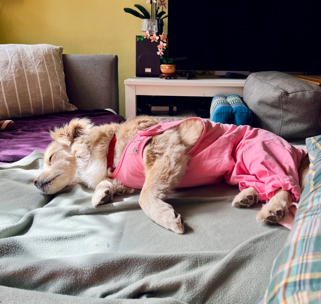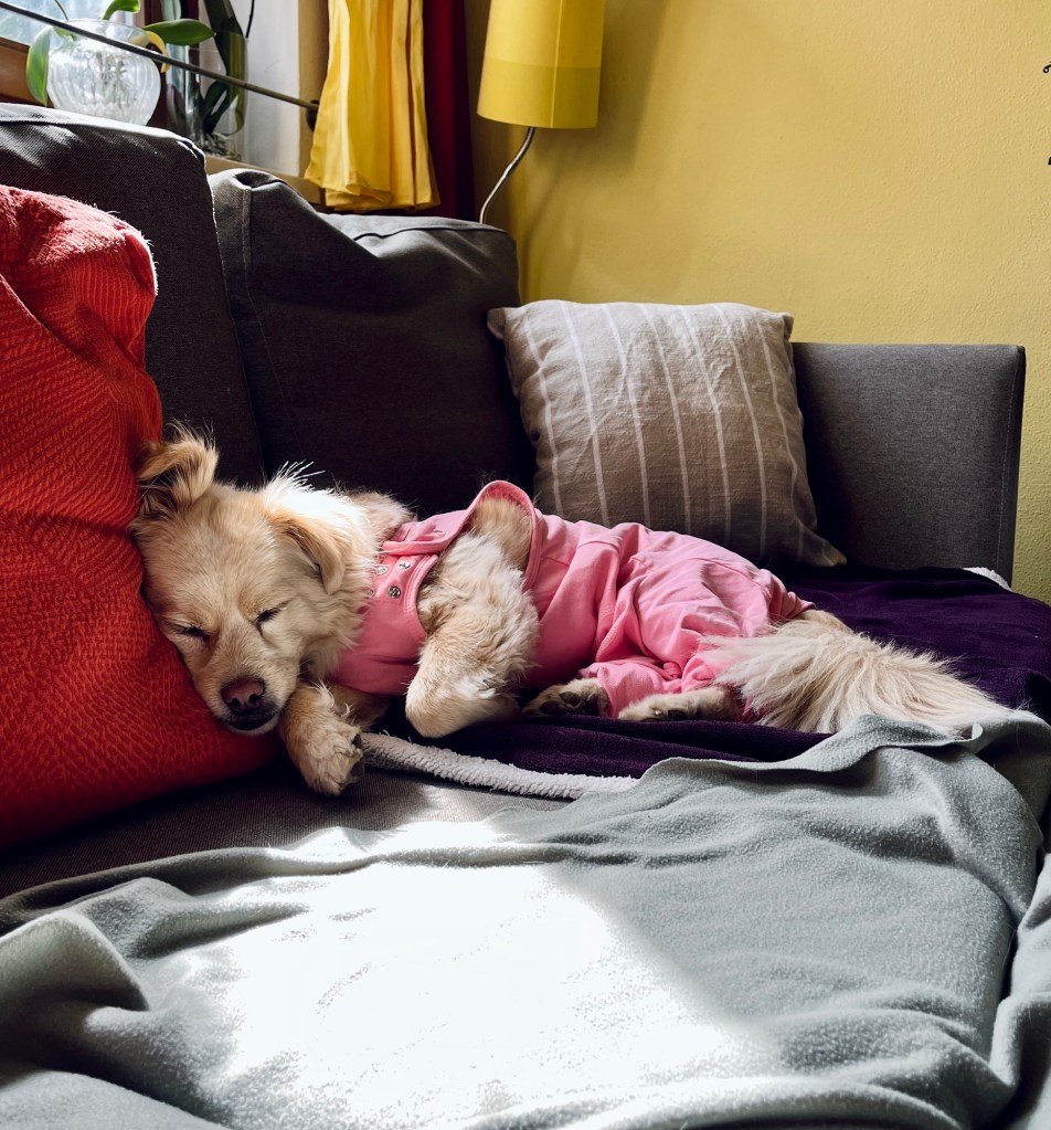 Nachts schlaf ich außerdem wieder mit Fenja am Sofa – das geht einfacher mit dem Trichter aka Schleckschutz, weil‘s mehr Platz gibt als im Bett.