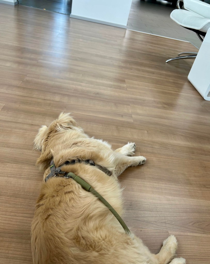 Gestern war Fenja im Autohaus mit. Wenn man schon keine Bewegung machen darf, muss wenigstens das Hirn gefordert werden: